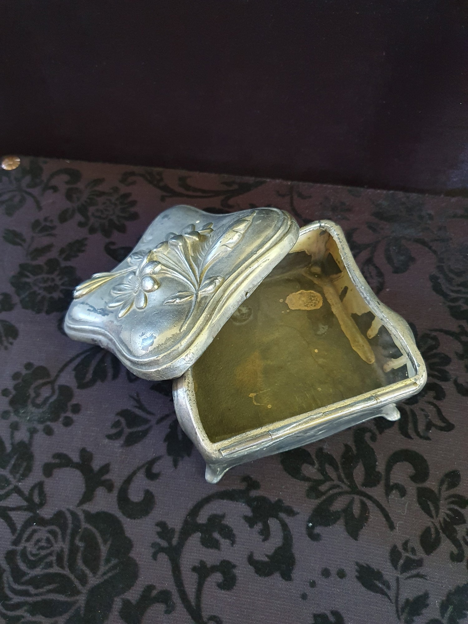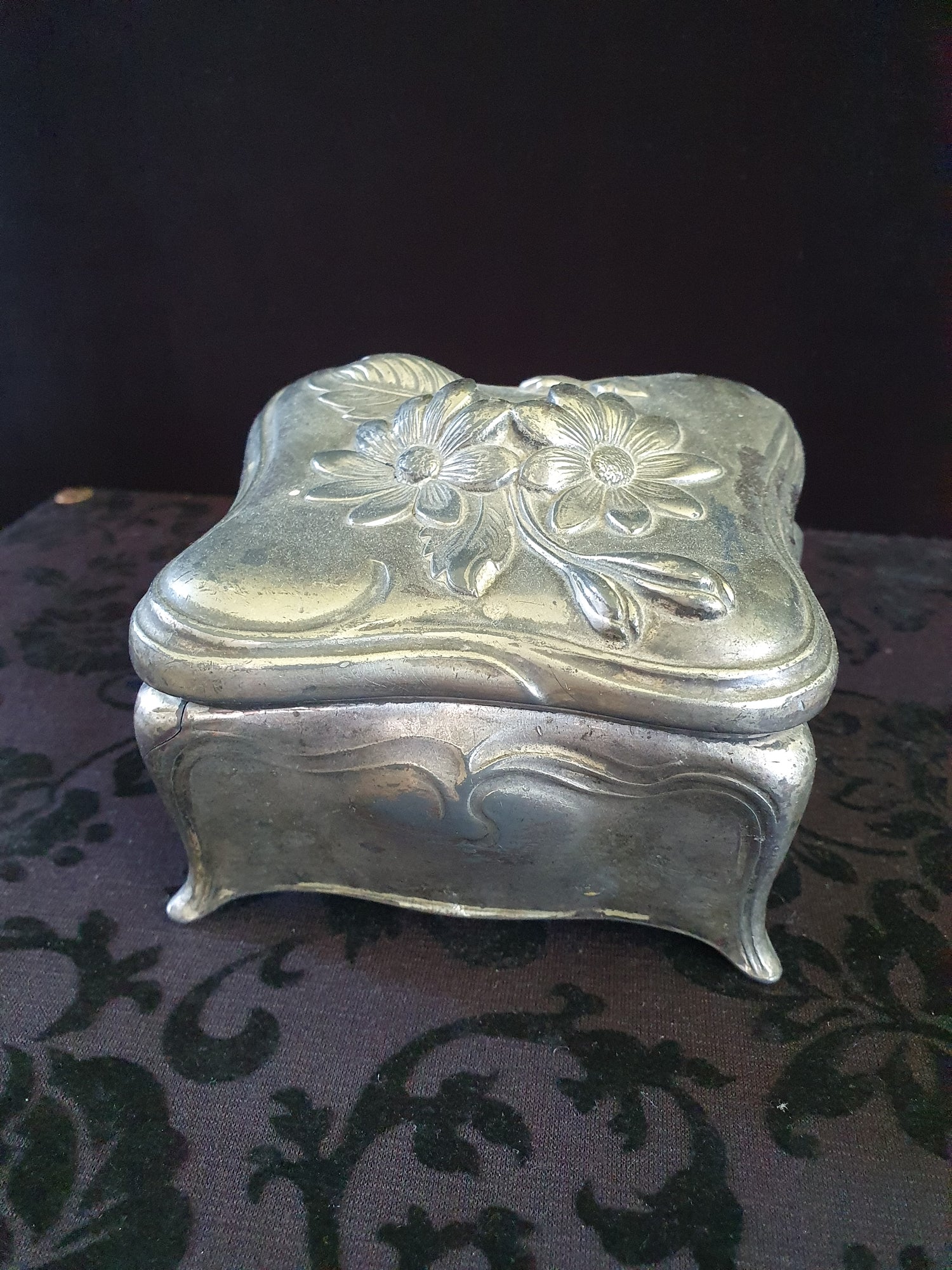 The lid displays a classic Art Nouveau floral repoussé design with flowing curves and stylised petals. The box sits on four feet and has a softly scalloped shape typical of turn-of-the-century American decorative metalwork.